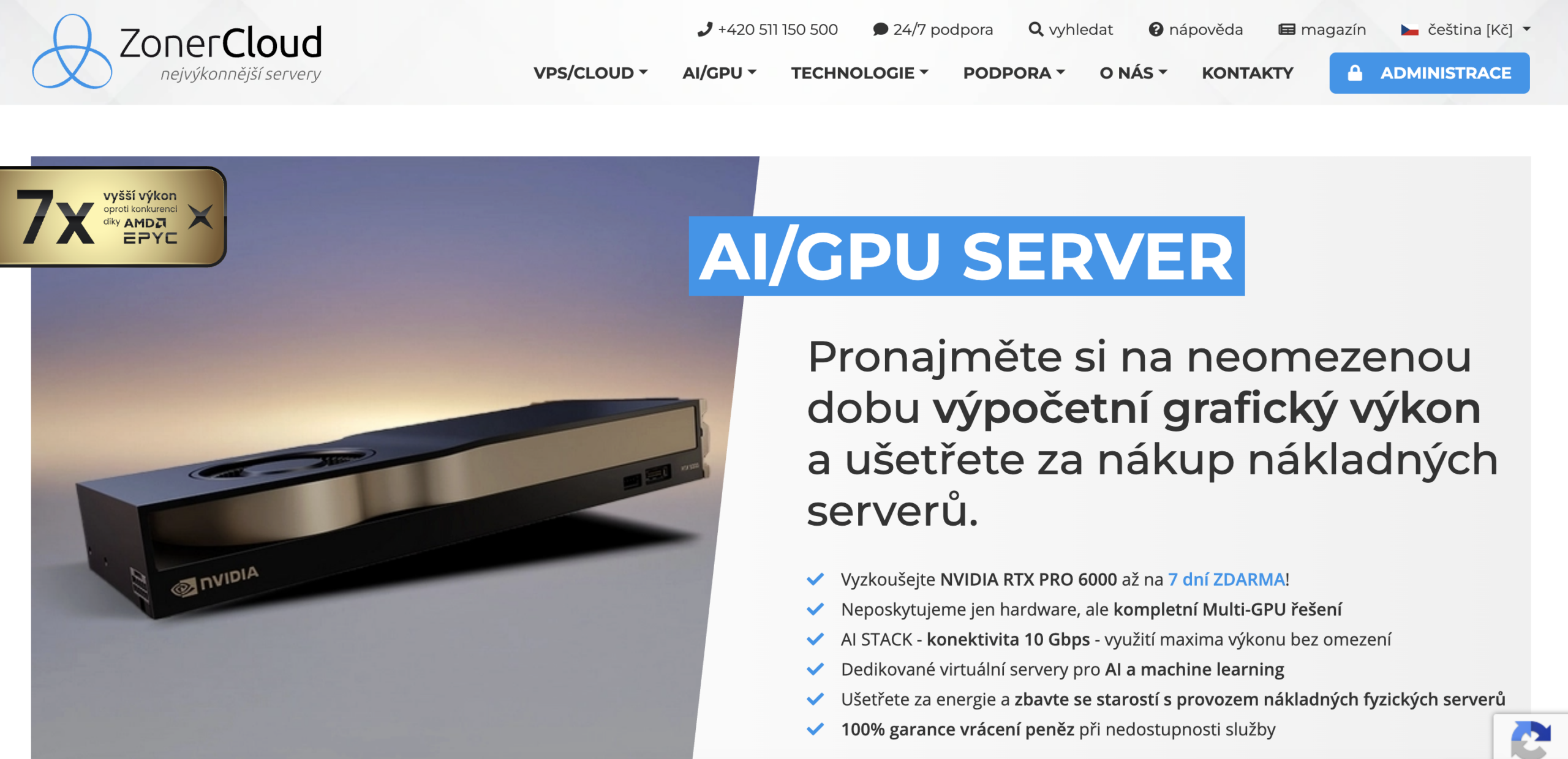 ZonerCloud umožňuje pronajmout si profesionální GPU bez nutnosti investovat do drahého hardware a zákazníci si ho mohou vyzkoušet zdarma. Stačí vybrat konfiguraci a během několika minut běží plnohodnotný GPU server v českém datacentru – s nízkou latencí, garantovaným výkonem a podporou moderních výpočetních i AI nástrojů.