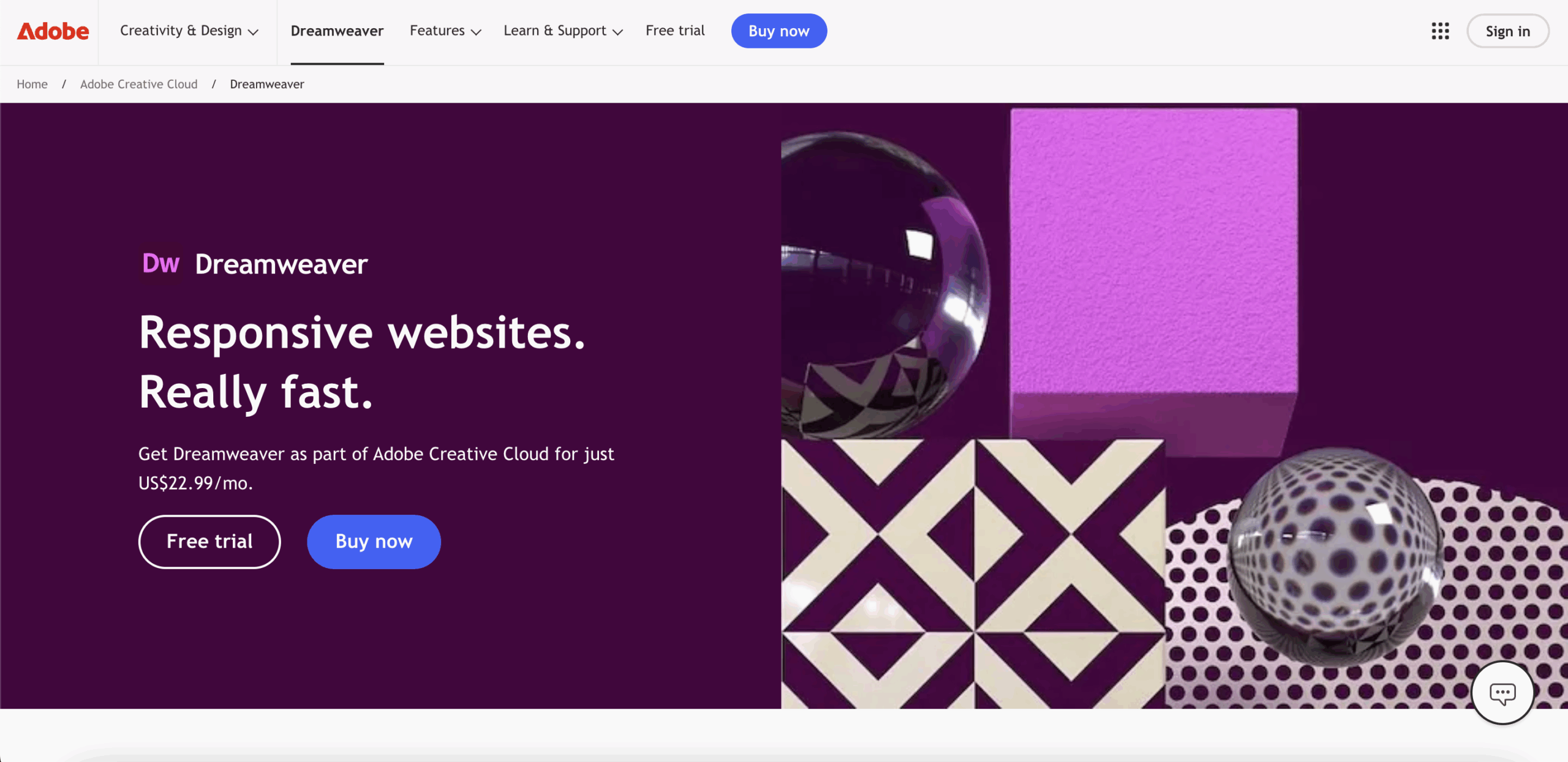 Známý profesionální editor kódu Adobe Dreamweaver také umožňuje vytvářet responzivní weby od nuly nebo pomocí šablon s náhledem v reálném čase. Podporuje HTML, CSS, JavaScript i Bootstrap a nabízí chytré doplňování kódu, integraci s GitHubem či propojení s Photoshopem a Illustratorem.