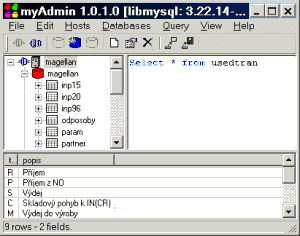 MyAdmin je nenáročný prográmek (cca 730 KB), který Vám velice usnadní práci s různými databázemi MySQL. Po stažení se nemusí ani instalovat, stačí pouze jen nakopírovat do vhodného adresáře a spustit. Funguje na všech Win95+ systémech. Domovská stránka programu je zde.