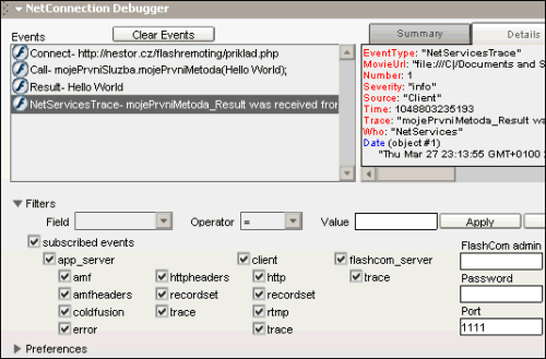 Dalším velmi užitečným nástrojem je NetConnection Debugger, díky kterému můžeme přehledně vystopovat, co přesně se děje při komunikaci mezi klientem a serverem: