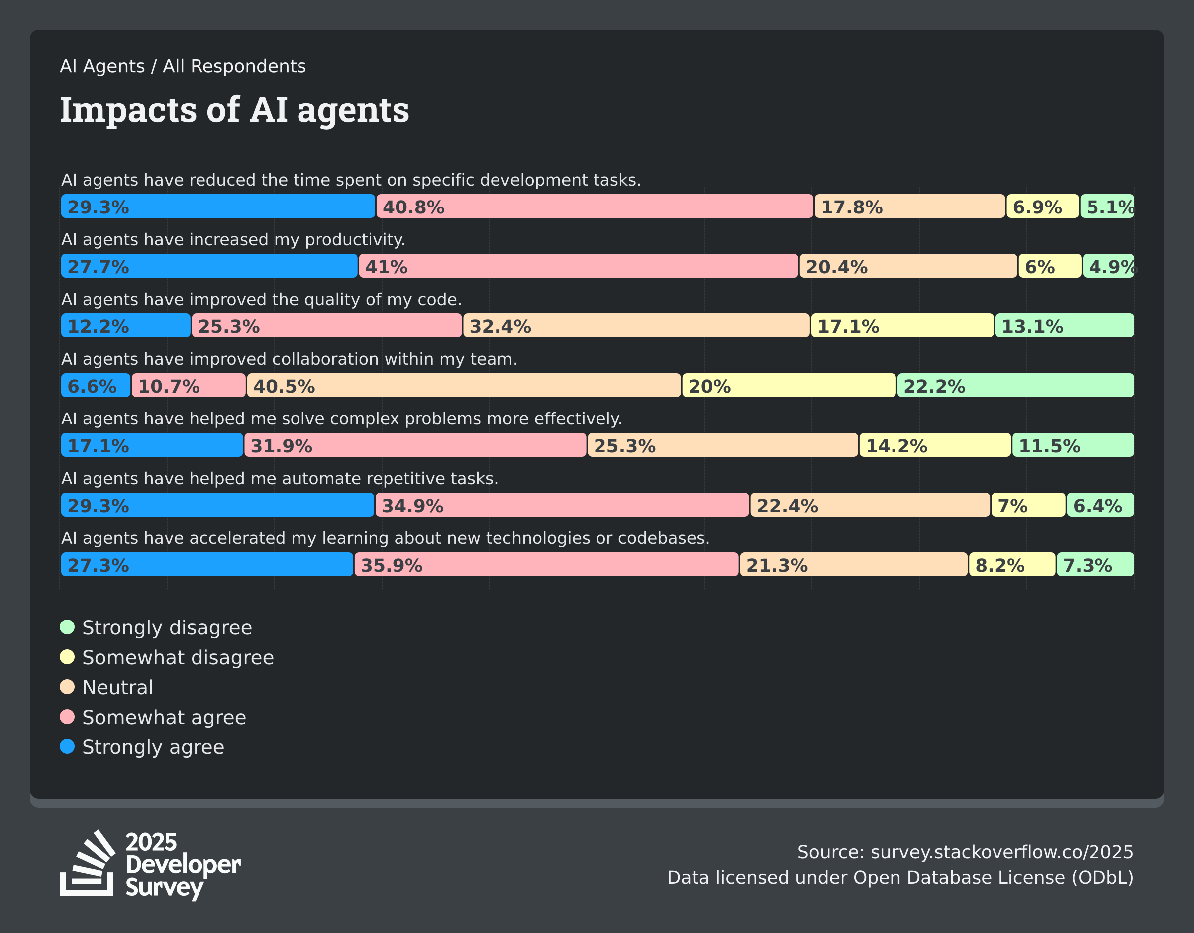 Průzkum Stack Overflow Developer Survey 2025 mezi desítkami tisíc vývojářů z celého světa (přes 49 tisíc vývojářů ze 177 zemí) ukazuje jednoznačný trend – AI se stala běžnou součástí vývoje softwaru, ale zároveň přináší nové výzvy. Respondenti odpovídali na otázky týkající se každodenního workflow, návyků, důvěry v AI výstupy, využívání agentů a toho, jak generativní nástroje mění jejich práci.