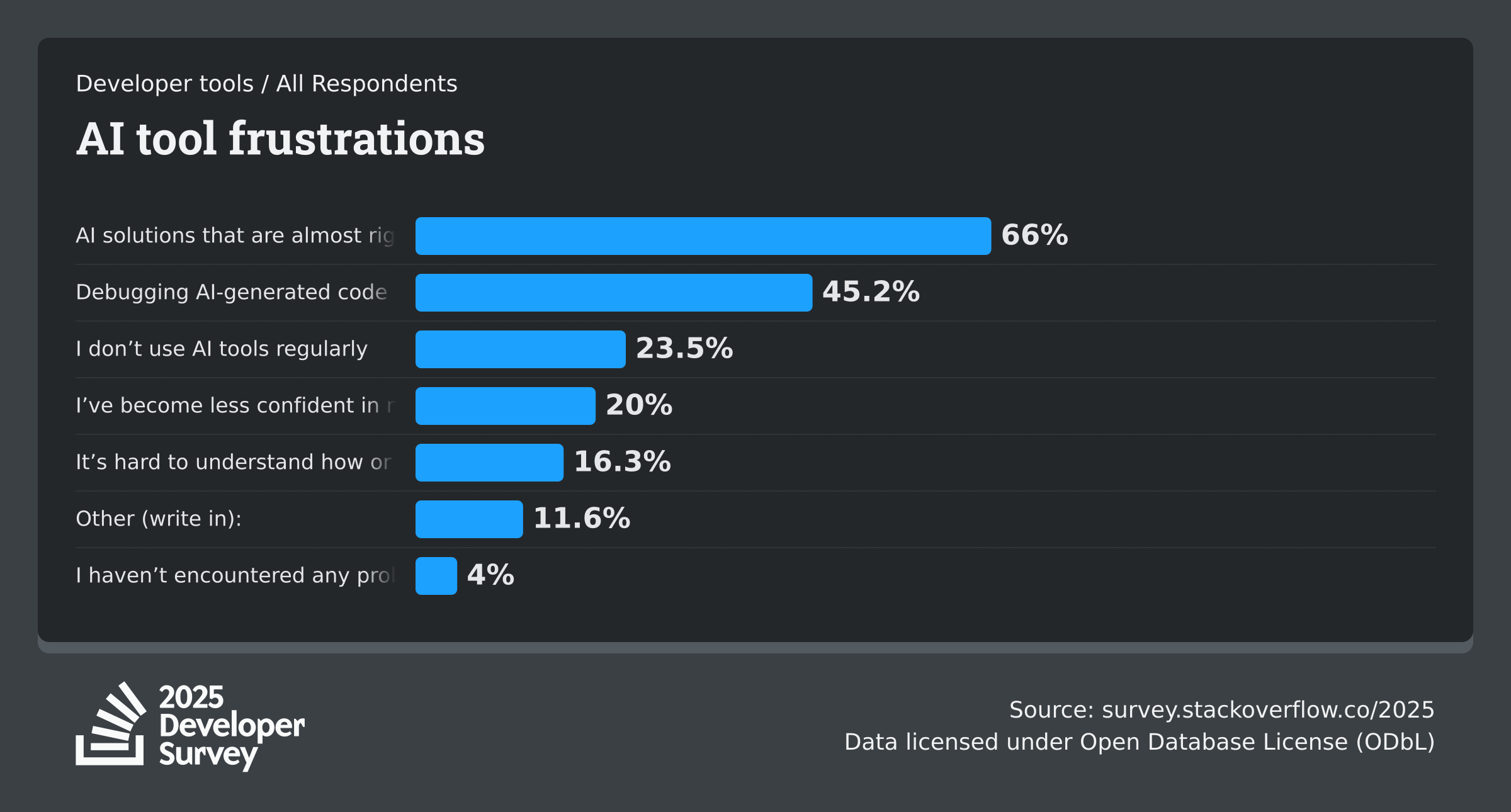 Zatímco používání umělé inteligence roste každým rokem, důvěra v přesnost výstupů má opačný trend. Vývojáři častěji uvádějí, že výstupy AI jsou sice rychlé, ale vyžadují ruční kontrolu a dodatečné ladění.